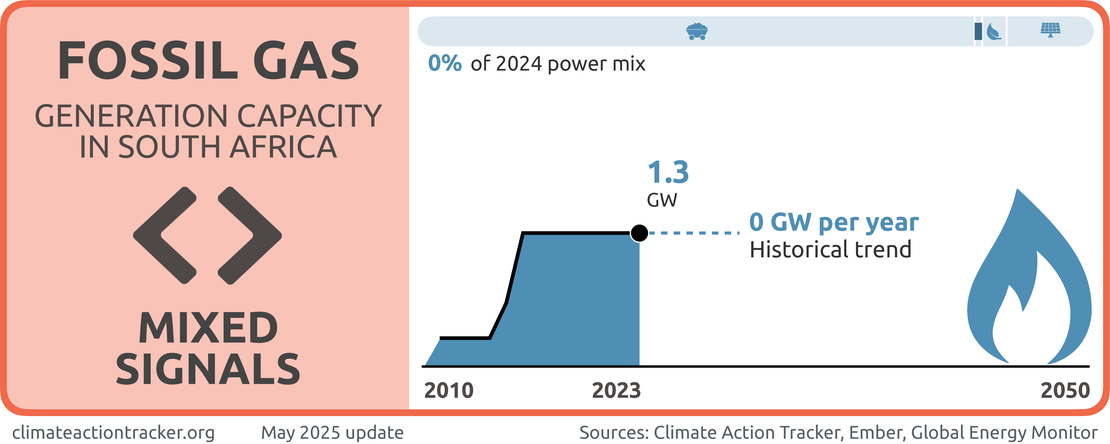 South Africa has begun implementing stated plans to increase fossil gas capacity, although progress is slow. In December 2023, the government issued a request for proposal for 2 GW of fossil gas power plant capacity. The bid window has since been extended to March 2025 following issues with the initial process, meaning additional gas capacity is yet to enter construction stage, as of early 2025 (Department of Mineral Resources and Energy, 2024a).