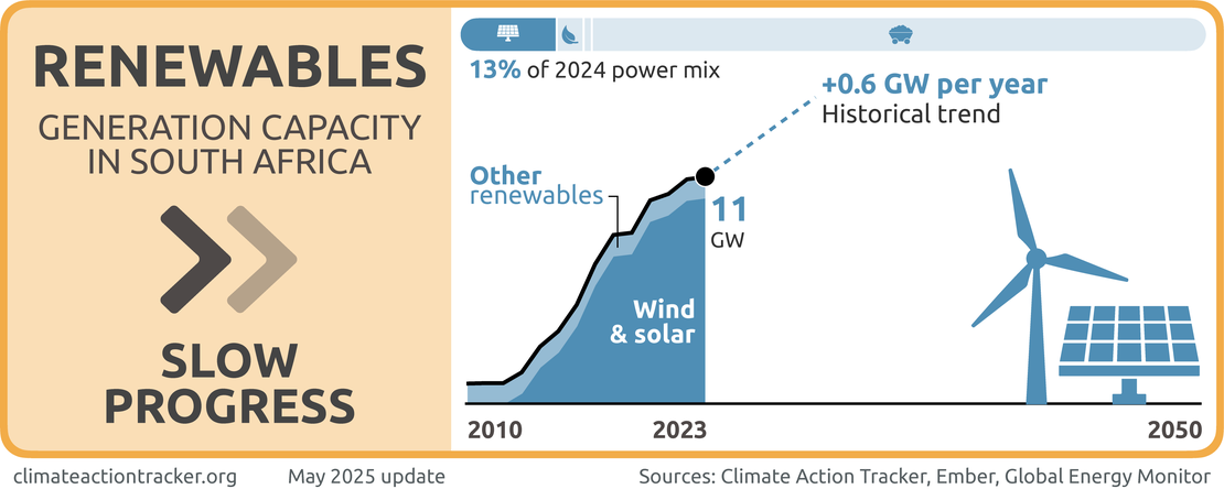 South Africa is making “Slow Progress” on deploying renewables. Despite commendable progress in recent years in challenging circumstances, the country’s grid remains dominated by fossil fuels. The approved 2019 Integrated Resource Plan targeted 27.6 GW of renewables to be installed by 2030, excluding large hydro. At just under 10 GW of installed renewable capacity as of 2023, South Africa’s renewable expansion plans are off-track (Cunliffe, 2023). Furthermore, the draft 2023 IRP lowered the expected installed capacity of wind and solar by 2030. Nonetheless, wind and solar capacity and generation has been ramping up in South Africa in recent years, rising from 4.5% of total generation in 2019 to 11.6% in 2023 (Ember, 2025). South Africa will need international support to ensure that current ambition levels are retained and increased further to maximise the country’s potential for renewable electricity generation.