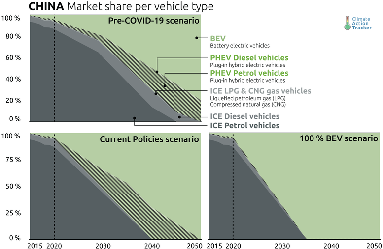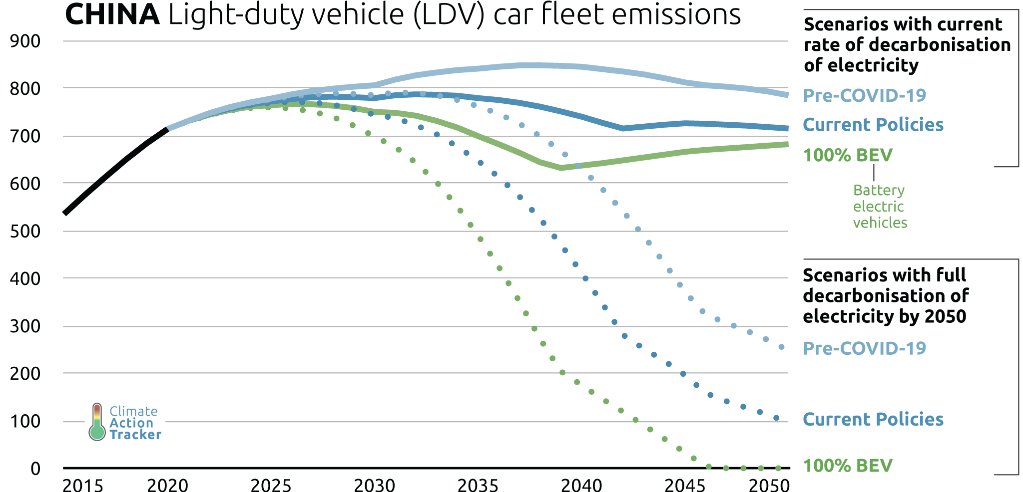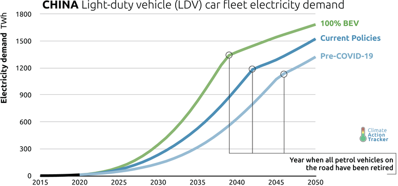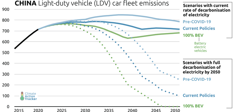 For China to achieve its long-term carbon neutrality goal by 2060, achievement of a 100% BEV vehicle stock is required, along with power sector decarbonisation.