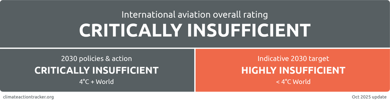 The CAT rates international aviation’s targeted emissions level in 2030 under its carbon neutral growth goal as “Highly insufficient,” indicating that the target is consistent with warming of 4°C, if all other sectors were to follow the same approach as international aviation. This rating is based on the CO2 emissions level only and does not consider the non-CO2 climate impacts of aviation.