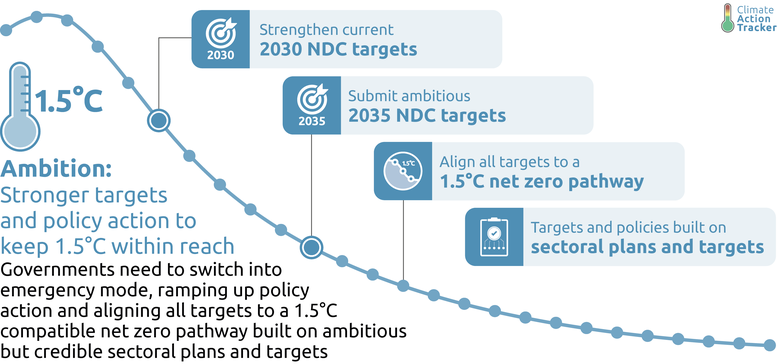 - Governments should propose ambitious 2035 NDC targets aligned with a 1.5°C compatible net-zero pathway by early 2025 so that COP30 in Brazil can fully evaluate progress towards 1.5° alignment.