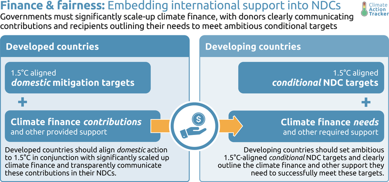 - Developed countries should set 1.5°C aligned domestic mitigation targets in their NDCs and communicate the financial and other support they will provide to developing countries.