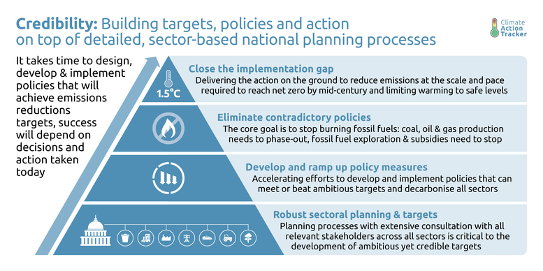 - Governments need to ramp up implementation of their existing targets and further develop policies to close the – still significant – emissions gap between current policies and 1.5°C compatible pathways.