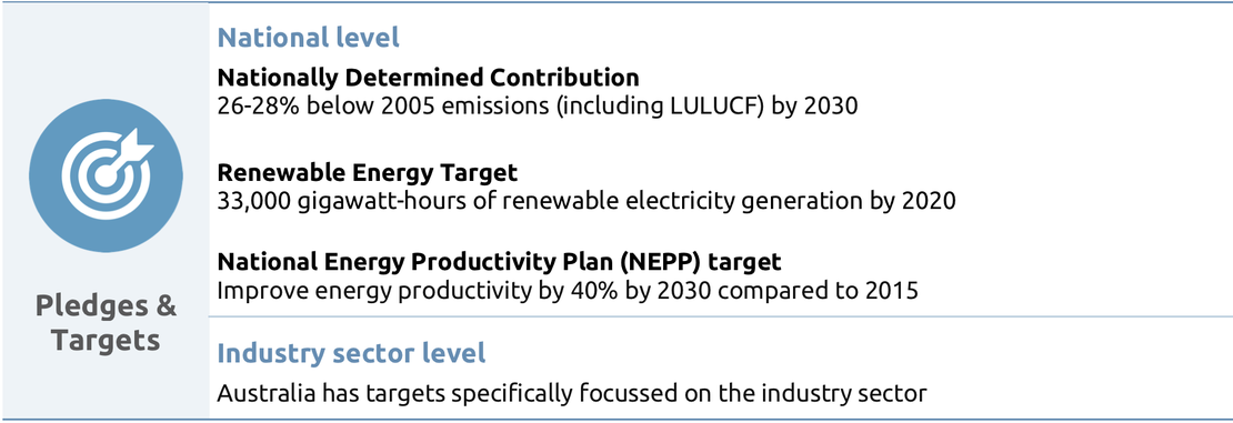 These tables from the report give an overview and analysis of the key factors of Australia's governance to enable effective climate action. We look at the country's key institutions, strategies, targets and legislation, as well at a sectoral level for the industry sector.