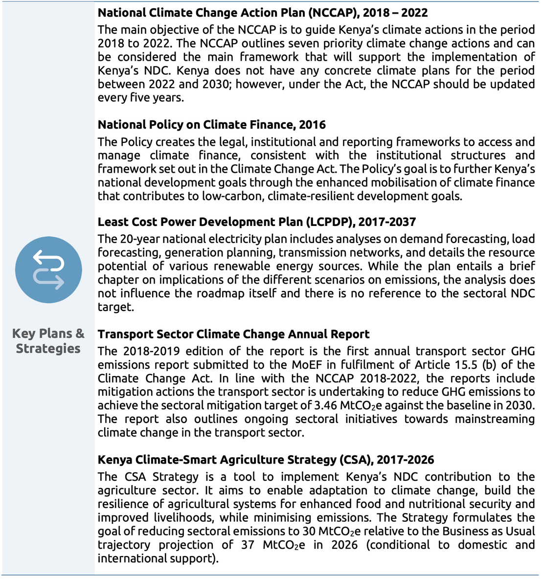 There have been no substantial developments in Kenyan climate governance since the publication of the National Climate Change Action Plan (NCCAP) 2018-2022, which was included in the CAT’s last assessment for Kenya. The government is still in the process of implementing the climate governance structures set out in the 2016 Climate Change Act. Further, the Kenyan Government plans to publish its updated NDC in the coming months, and has initiated the process of developing the country’s "2050 Long-Term Greenhouse Gas Strategy and Carbon Resilience Development Pathway under the Paris Agreement". The updated NDC and the Long-Term Strategy (LTS) will reveal whether the structural and institutional measures that have been established will result in adequate climate mitigation action. Similar to Kenya's 2030 Vision and the President's Big Four agenda, climate change or transition-related aspects are also not a priority in the country's economic stimulus program, which is intended to support vulnerable citizens and companies affected by COVID-19.1