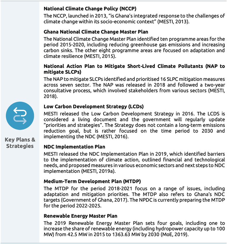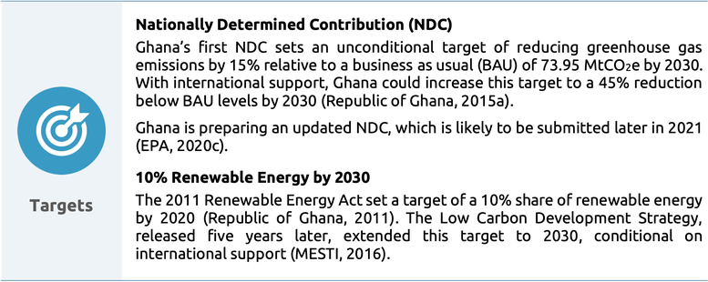 Ghana has no long-term decarbonisation target nor strategy. Its low-carbon development strategy focuses on the period up to 2030. Ghana’s Renewable Energy Act provides the legislative framework for renewable energy development, but the country has no other climate-related legislation in place, and there is no evidence to suggest the government is committed to developing such legislation.