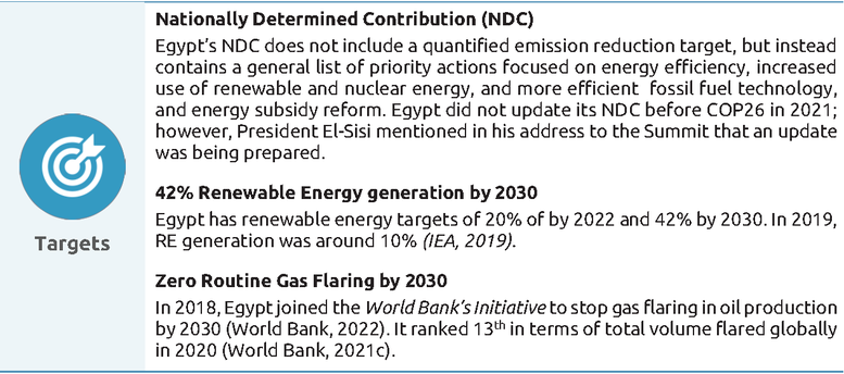 President El-Sisi has not been a strong advocate of the need to transition the Egyptian society and economy towards net zero emissions, though this may change as Egypt prepares to host the climate negotiations in November 2022. He has traditionally focused on the importance of climate adaptation and emphasised the need for climate finance from developed countries. More broadly, expanding the country’s natural gas production is a top priority for government officials, both for the country’s own energy security and as a valuable export commodity, not starting on the path to decarbonisation.