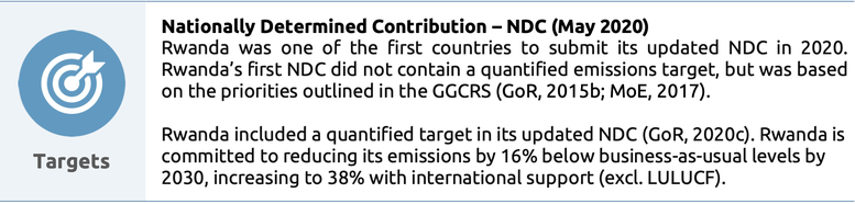 Rwanda does not appear to have a dedicated review mechanism focus on climate action, but will incorporate this into existing processes. Nor does it have a formal ratchet up mechanism to ensure regular review and continous updating of its NDC, though it was one of the first countries to submit its updated NDC in 2020.