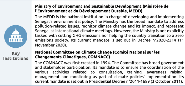 Senegal does not have an authoritative body with an explicit and clear mandate to provide climate or energy transition-related advice to the government, though some agencies do advise the government on mitigation-related matters and may be capable of playing such a role.
