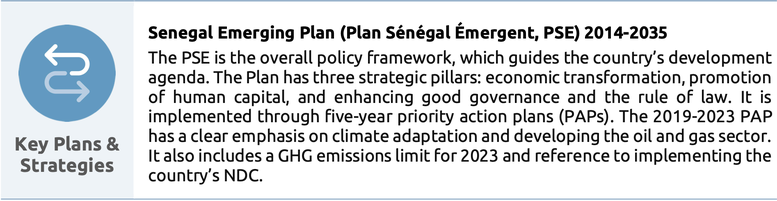As a result of the limited effective coordination of climate action, the need to transition to a zero emissions society has not been mainstreamed into sectoral policies. While reference to Senegal’s NDC or other mitigation measures can be found in some sectoral policies, there is a lack of strategies encompassing all transition-related issues in a given sector. Actions are fragmented between and within ministries.