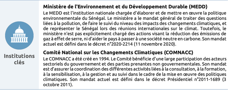 Le Sénégal ne dispose pas d'un organisme faisant autorité et doté d'un mandat explicite et clair pour fournir des conseils au gouvernement en matière de climat ou de transition énergétique, bien que certaines agences fournissent des appui-conseil au gouvernement sur des questions liées à l'atténuation et puissent être capables de jouer un tel rôle.