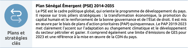 En raison du manque de coordination efficace de l'action climatique, la nécessité d'une transition vers une société à zéro émission n'a pas été intégrée dans les politiques sectorielles. Bien que l'on puisse trouver des références à la CDN du Sénégal ou à d'autres mesures d'atténuation dans certaines politiques sectorielles, il y a un manque de stratégies englobant toutes les questions liées à la transition dans un secteur donné. Les actions sont fragmentées entre et au sein des ministères.