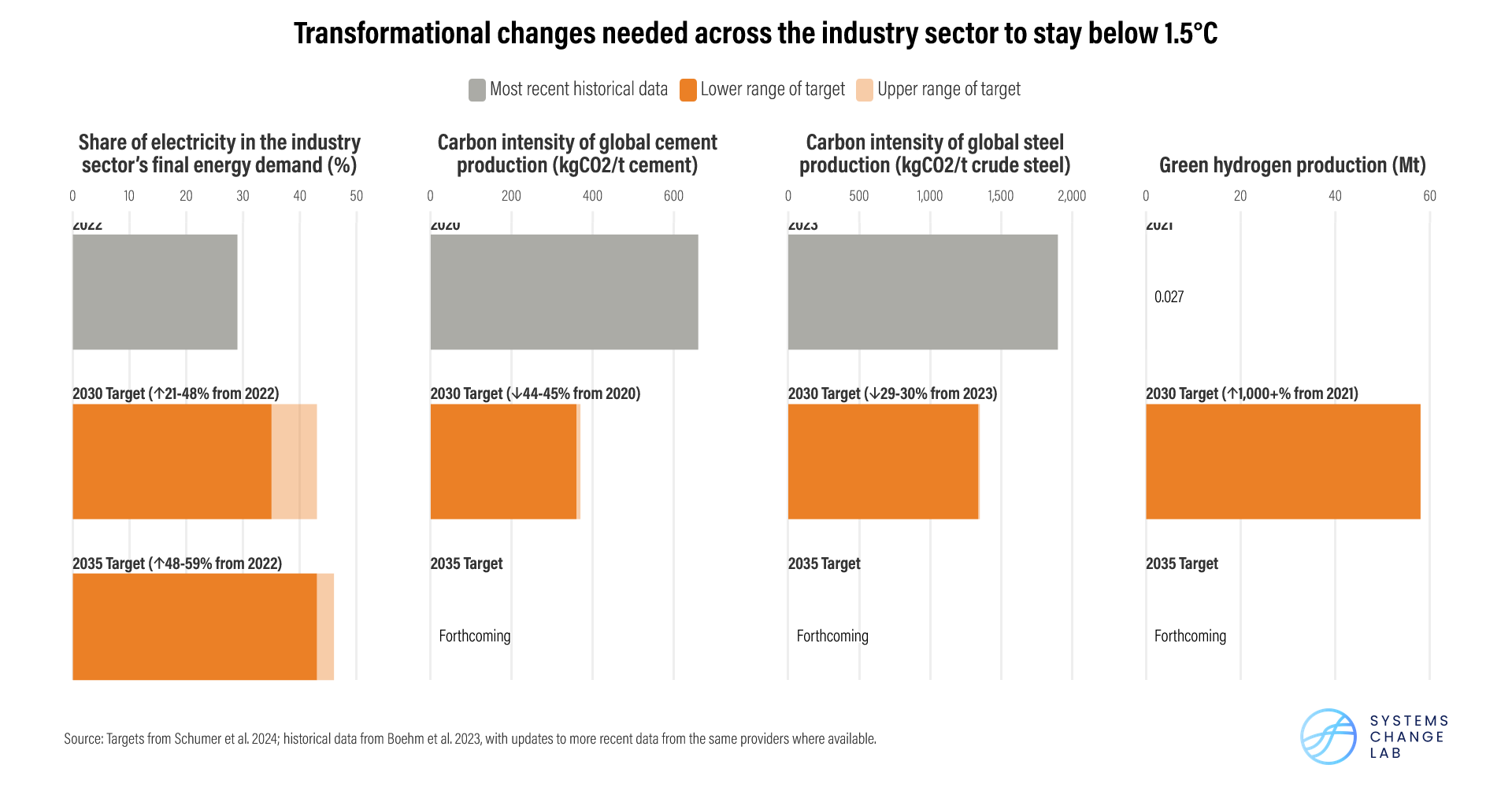Critically, countries do not need to progress at the same pace to collectively achieve these global sectoral goals. Developed countries have a responsibility to go furthest, fastest, and while other major emitters will also need to decarbonize rapidly, some may require finance and other support to do so. Still, these targets, alongside collective sectoral goals outlined within the Global Stocktake, offer a helpful starting point for countries as they develop their NDCs by specifying the pace and scale of transformational change needed across the most emissions-intensive sectors: