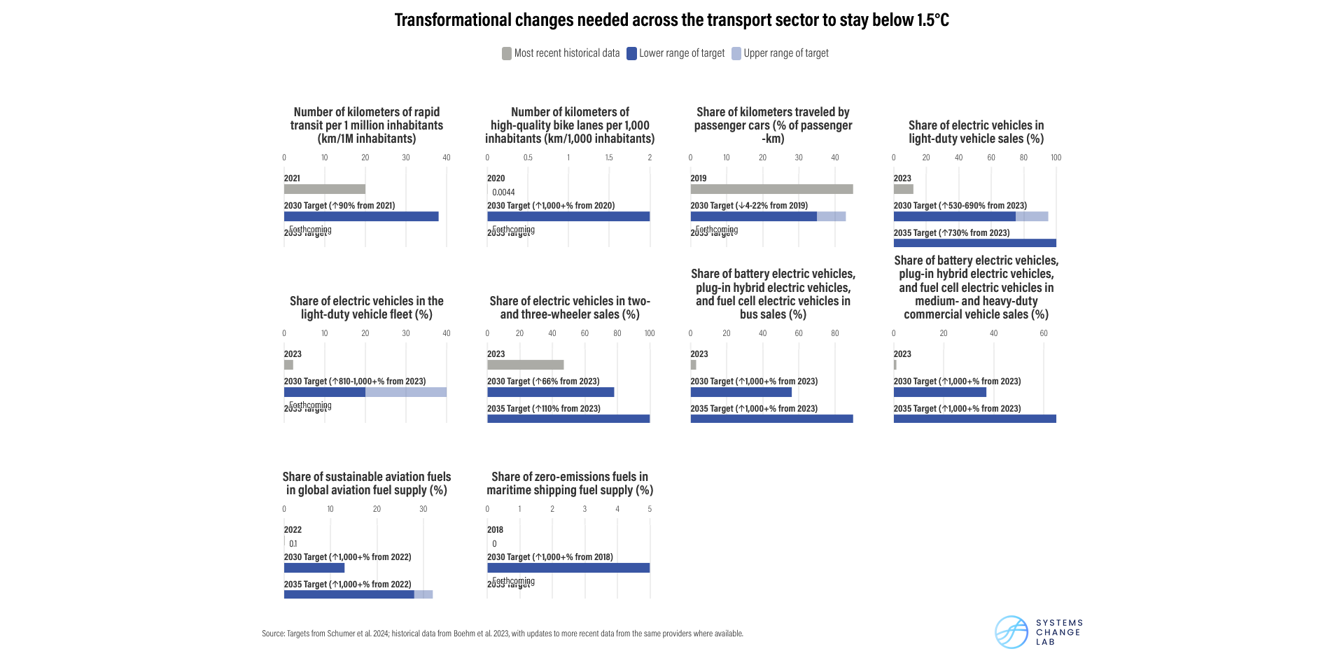 While unique country contexts will influence the transport targets that countries adopt in their NDCs, the scale of required changes globally are substantial across all prongs. For example, today’s rapid transit networks like metro rails, light-rail trains and bus lanes must expand by 90% by 2030. Electric vehicles’ current share of light-duty vehicle sales must increase by upwards of 690% by 2030 and 730% by 2035, while shares of sustainable aviation fuels and zero-emissions fuels in maritime shipping must both grow by more than 1,000% by 2030, relative to today’s levels.