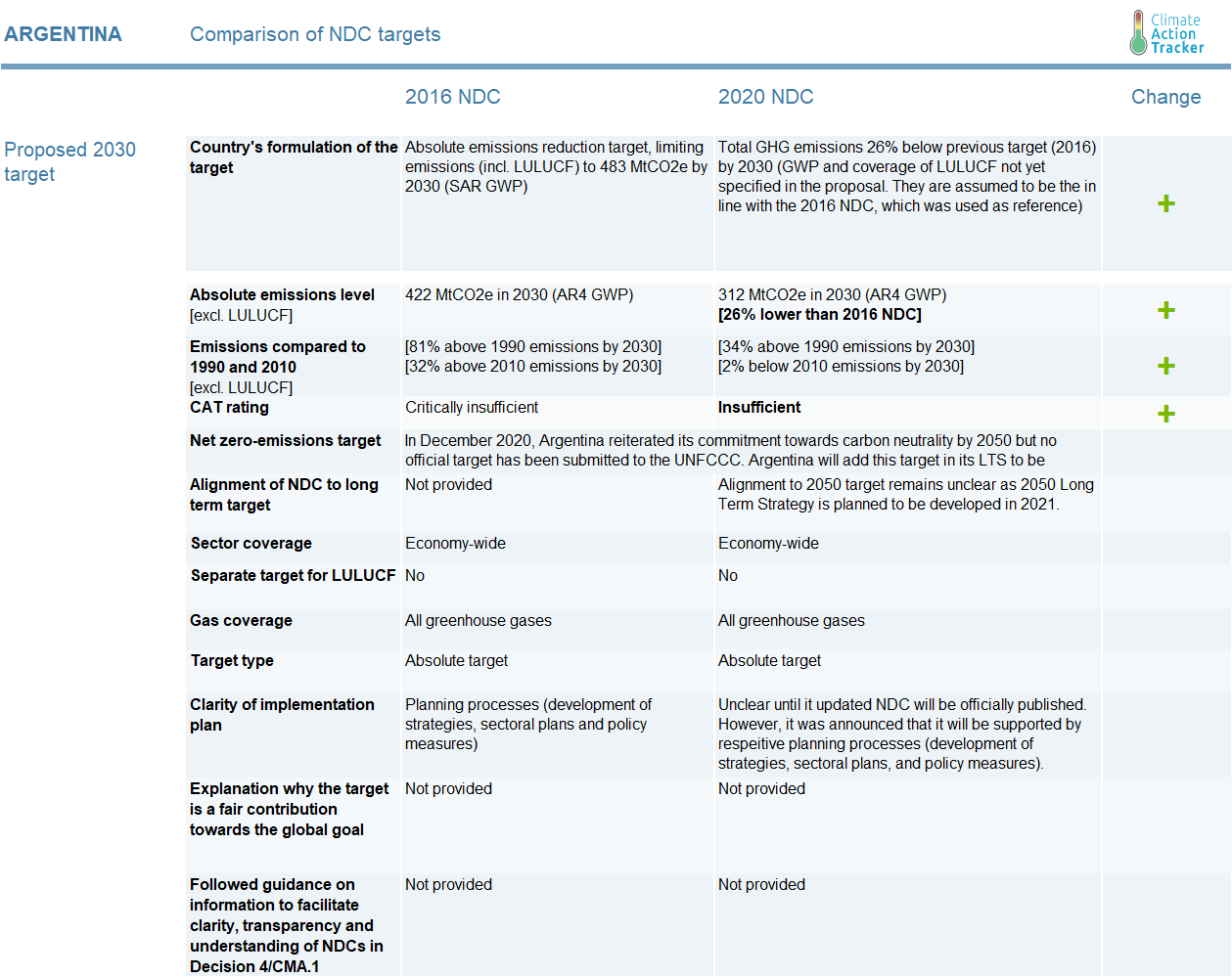 On 12 December 2020, President Alberto Fernandez announced Argentina’s enhanced NDC target of 26% reduction below its previous NDC at the Climate Ambition Summit. This target is a significant improvement from the previous unambitious target.