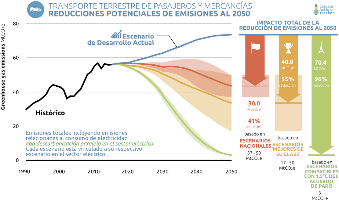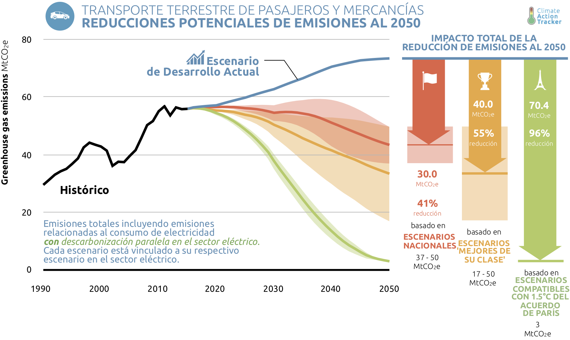 Las trayectorias sectoriales compatibles con el Acuerdo de París reducen casi totalmente las emisiones de carbono del sector de transporte terrestre de pasajeros y mercancías de Argentina para el año 2050. Esto requiere un cambio modal sustancial en el transporte de pasajeros y mercancías, la introducción de vehículos de cero emisiones, autobuses y camiones, y un endurecimiento de las normas de ahorro de combustible de CO2 para los nuevos vehículos particulares. Esto descarbonizaría completamente el sector de transporte de pasajeros y mercancías de Argentina a mediados de siglo bajo la condición de que el sector de suministro de electricidad esté completamente descarbonizado para 2050, en línea con el objetivo de temperatura del Acuerdo de París.