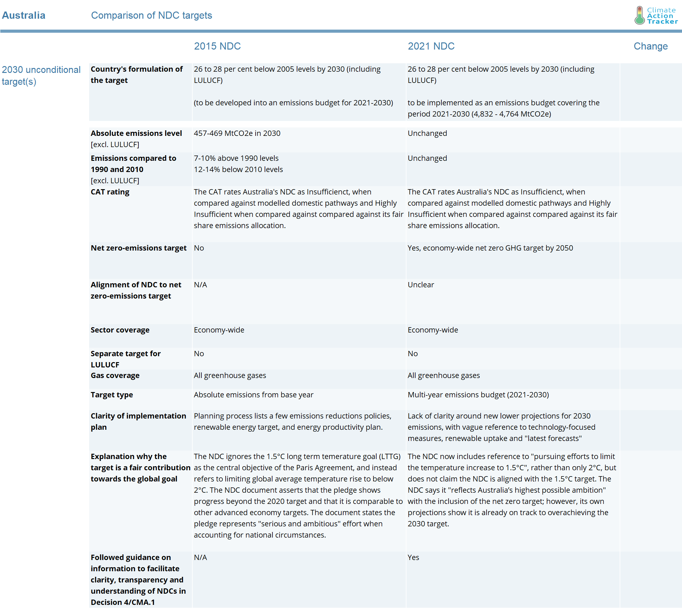 Australia submitted its updated NDC to the UNFCCC on 28 October 2021. The update did not increase the ambition of Australia’s mitigation target, despite requirements under the Paris Agreement for countries to increase ambition with each update.