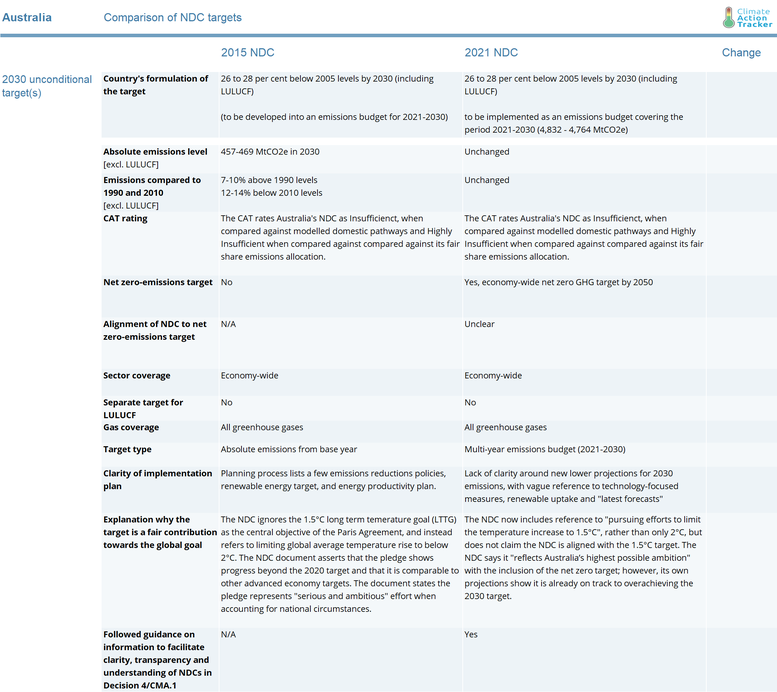 Australia submitted its updated NDC in October 2021. The update recommunicated Australia’s unchanged 2030 target it first submitted in 2015. The CAT rates this target as 'Highly insufficient' when compared to its fair-share emissions allocation and 'Insufficient' when compared to the emissions cuts that need to occur within Australia's borders.