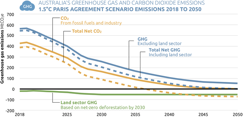 - Australia can achieve net zero GHG emissions by 2050 if it takes action to halt deforestation by 2030, and if it maintains the storage of carbon in forests projected for 2030 until 2050. This would be needed to outweigh remaining greenhouse gas emissions from hard-to-abate sectors, particularly agriculture. To achieve this the 2030 GHG reduction target (including LULUCF) would be about 66% below 2005 levels.