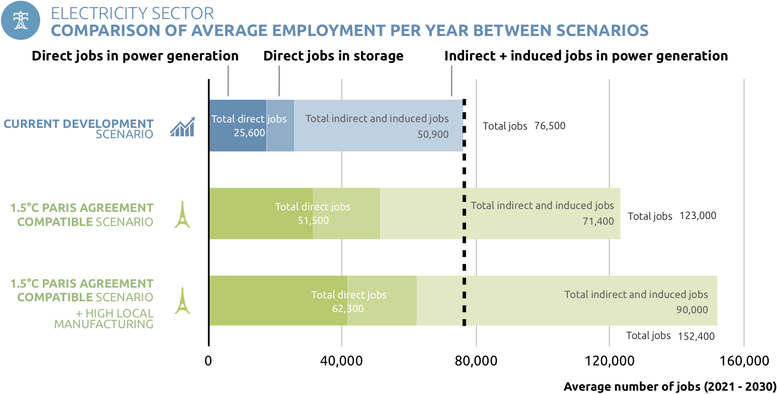 - Accelerating the transition towards a zero carbon, renewables-based electricity supply by the 2030’s will bring large domestic employment opportunities to Australia with about 46,000 additional jobs between 2021-2030 compared to the current trajectory and, if combined with a policy to incentivise more local manufacturing of wind turbines, solar panels and batteries would reach 76,000.