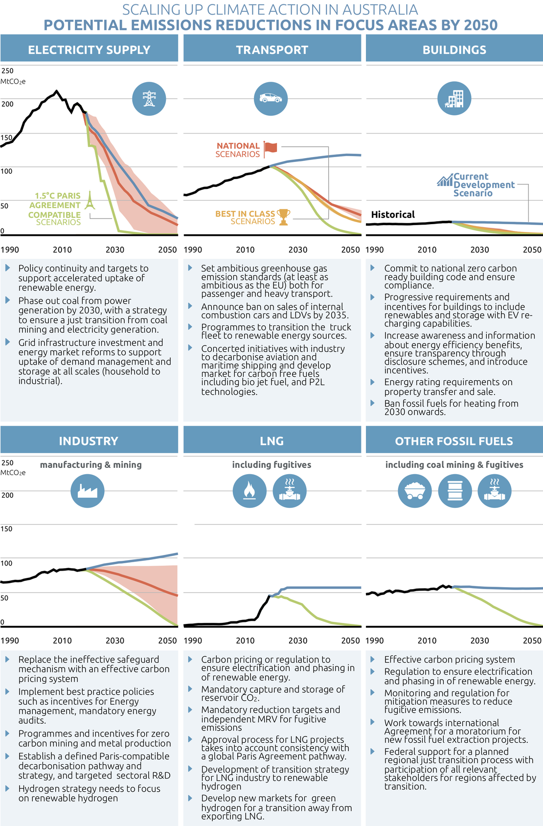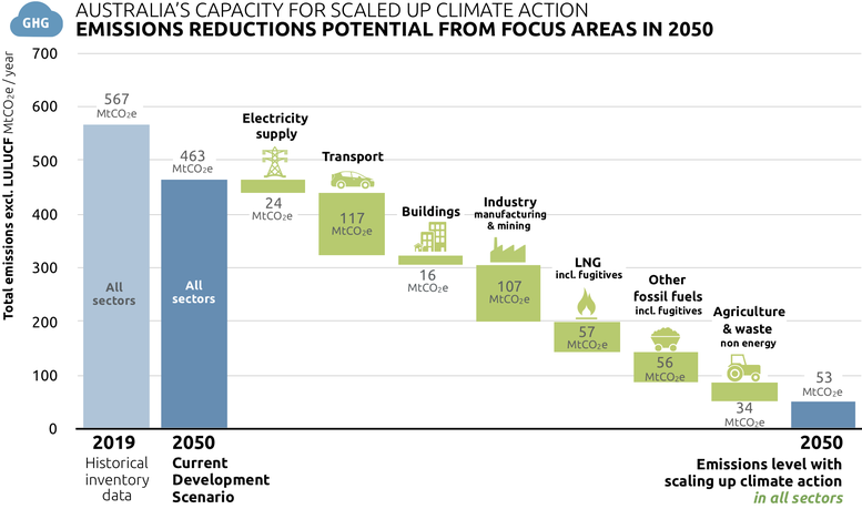 This report shows that Australia, has tremendous potential to scale up climate action in all sectors. Increasing climate action would initiate sectoral transitions towards a zero-emissions society with the additional benefits of reducing air pollution, and creating employment including through new manufacturing value chains and new export opportunities based on renewable energy.