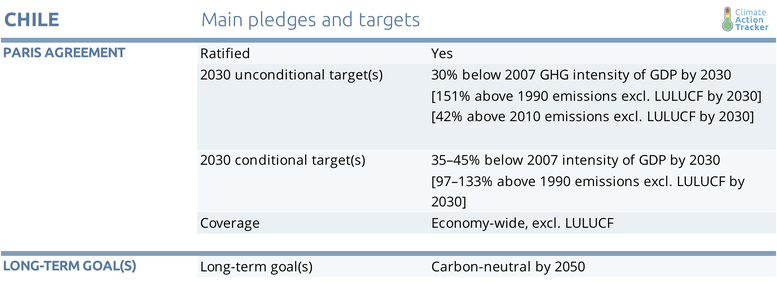 According to our assessment, Chile will meet its current Nationally Determined Contribution (NDC) unconditional target with currently implemented policies, under which emissions would reach levels (excluding LULUCF) of 122-126 MtCO2e by 2030 (8-12% above 2016 levels). Under a full implementation of all its planned policies, including the shutdown of all coal power plants and the electromobility strategy, Chile could overachieve its current conditional NDC target, and reach emissions levels (excluding LULUCF) of 99-101 MtCO2e by 2030 (11-13% below 2016 levels).