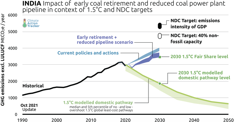 The measures investigated in this analysis - early retirement older coal power plants and re-evaluation of the coal pipeline – would align India with the level of policies and action consistent with its own “fair share” contribution to the Paris Agreement. Such measures would very likely result in a 1.5°C compatible rating under the Climate Action Tracker for its policies and actions.