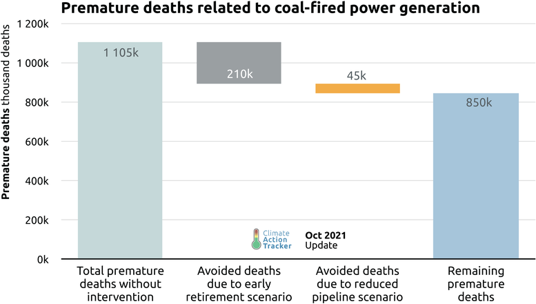 The implementation of an early retirement for old power plants and re-evaluation of the existing pipeline would also have spill-over effects beyond mitigation. We quantify effects on premature deaths resulting from air pollution, and find that India could avoid up to 255,000 premature deaths in the next decade (a reduction of almost a quarter) by reducing its reliance on coal-based electricity generation.