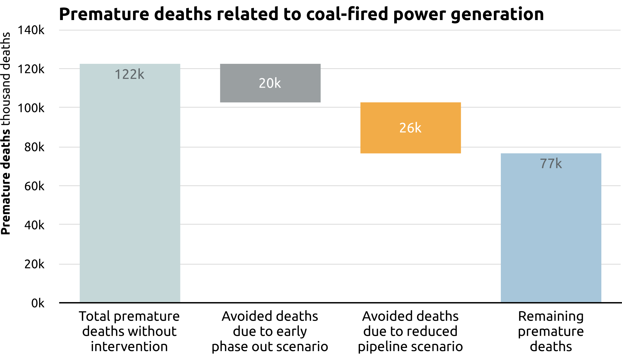 The implementation of an early phase out for old power plants and re-evaluation of the existing pipeline would also have spill over effects beyond mitigation. We quantify effects on premature deaths resulting from air pollution, and find that Indonesia could avoid over 45,000 premature deaths in the next decade (a reduction of almost 40%) by reducing its reliance on coal electricity.
