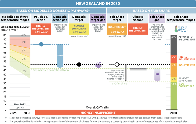 The CAT evaluates New Zealand’s net zero target as “Poor”. An updated assessment is forthcoming.