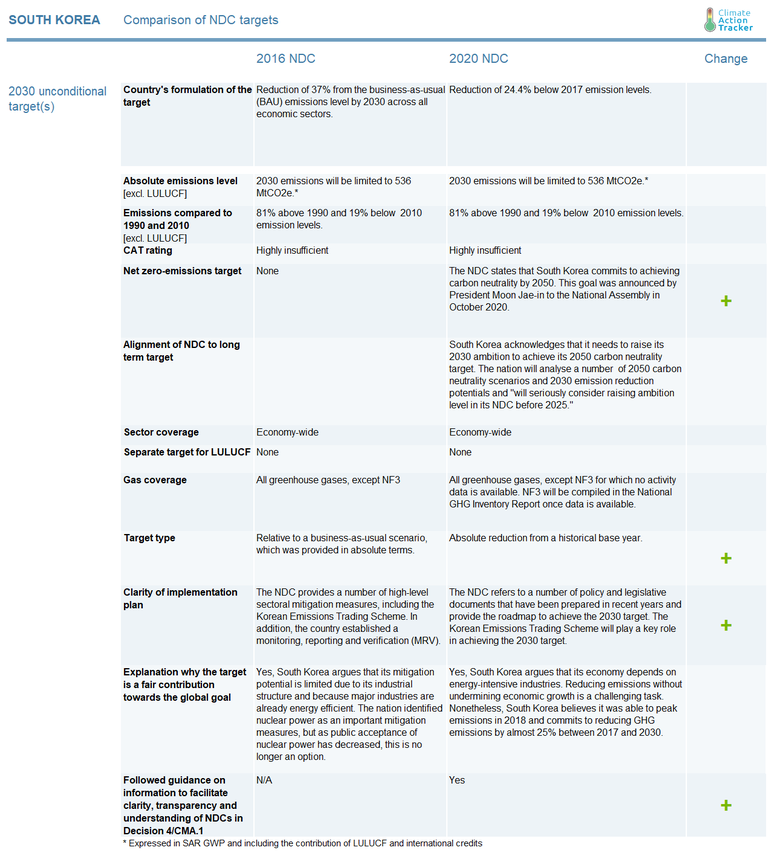 South Korea submitted its updated NDC in December 2020. Compared to its previous submission, South Korea has now put forward an absolute mitigation target instead of a reduction compared to a business as usual (BAU) scenario. Because the previous NDC provided this scenario in absolute terms, the previous NDC target was de facto also absolute. The updated NDC does not change the targeted 2030 emissions level in absolute terms and represents no enhancement of ambition.