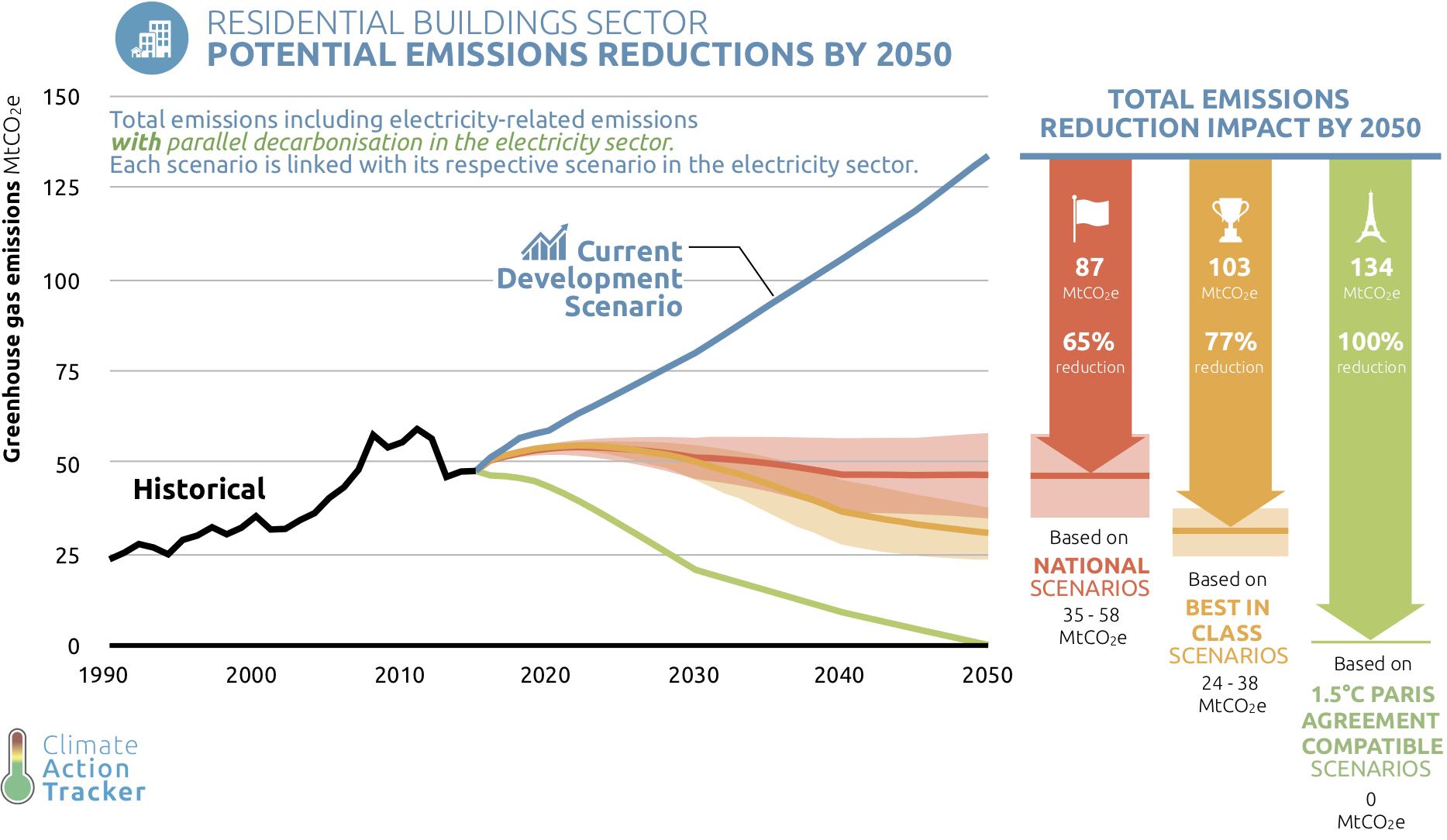 A Paris-compatible residential buildings sector requires strengthened standards for new buildings towards near-zero energy, and a deep renovation of existing residential buildings. Heating and cooking need electrification and energy efficiency improvements, also required for lighting and other appliances. In our Paris-compatible scenarios, such actions can reduce emissions in this sector by 40% to 50% by 2030 from today, and to zero by 2050. This includes electricity-related emissions, under the assumption that the electricity sector decarbonises.
