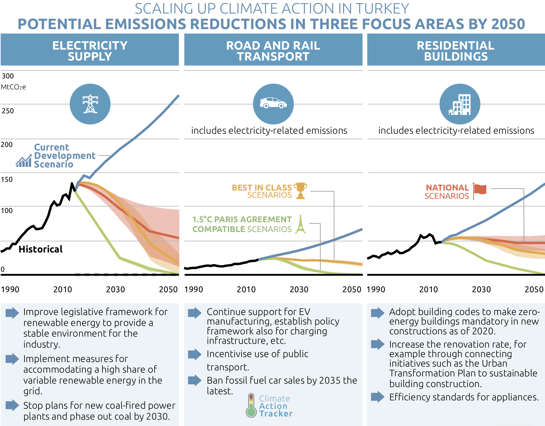In Turkey, there is tremendous potential to scale up climate action, including in the focus areas of this study, that is: electricity supply, road and rail passenger transport, and residential buildings. Increasing climate action now would initiate technically-feasible sectoral transitions towards a zero-emissions society while directly benefiting Turkey’s sustainable development agenda. This report, the fifth country assessment in the Climate Action Tracker's Scaling Up Climate Action Series, analyses three key areas where Turkey could accelerate its climate action: electricity supply, road and rail passenger transport and the residential buildings sector. The report illustrates GHG emissions reductions from such actions, along with other benefits for sustainable development.