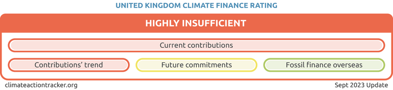 The UK’s reported contributions to financing emission reductions abroad fall far short of its fair share (Gabbatiss, 2023) contribution to the USD 100 bn goal which itself needs to be increased substantially to help drive the global energy transition (Pachauri et al., 2022). On this (most important) metric, the UK is therefore rated as “Highly Insufficient”.
