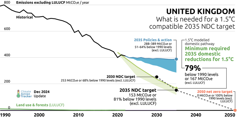 The UK submitted its 2035 NDC mitigation target on 30 January 2025 setting a target to cut emissions to 81% below 1990 levels by 2035 keeping the same headline ambition that it announced at COP29. This target covers all sectors and all gases. With its 2035 target of 153 MtCO2e, the UK has closed the gap between its target and our 1.5°C compatible MDP in 2035 and gone slightly below the threshold of 167 MtCO2e excluding emissions from land use, land use change and forestry (LULUCF).