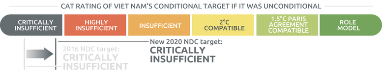 CAT’s rating is based on Viet Nam’s BAU targets. However, the first NDC had an additional sub-target for a 20% reduction in emissions intensity per unit of GDP compared to 2010 levels. The status of this additional intensity target was unclear, and it has now been dropped. CAT converted the intensity target to absolute emissions levels for 2030, calculated to be 872 MtCO2e/yr (excluding LULUCF). The old NDC sub-target was slightly more ambitious (4%) than the new NDC.