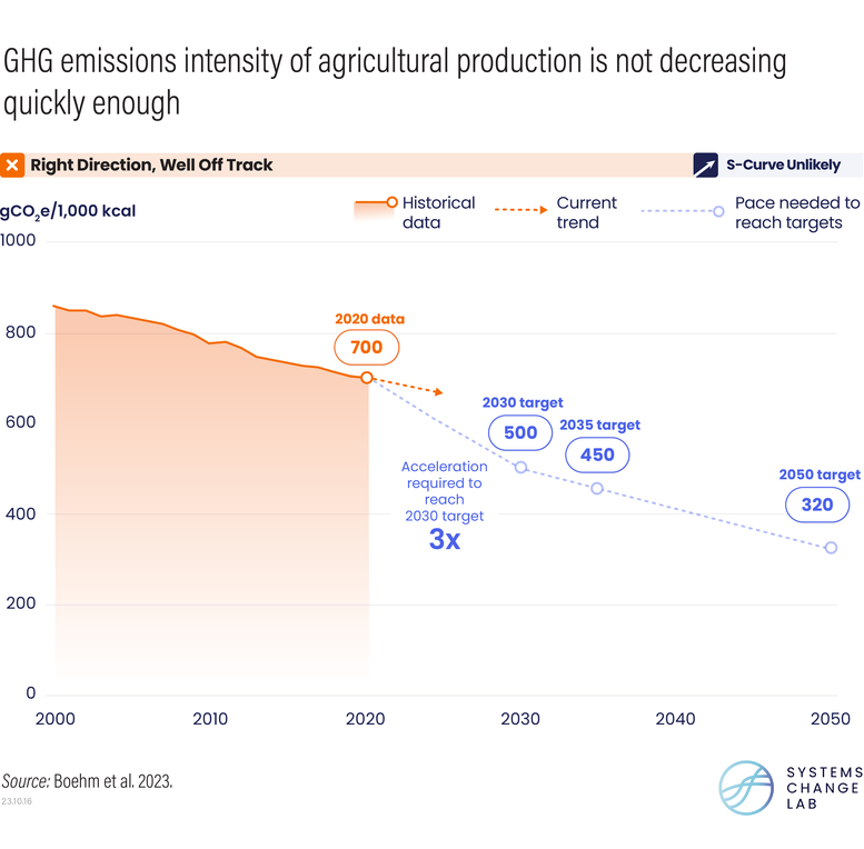 Though heading in the right direction, recent trends in these supply-side shifts remain too slow. Improvements in livestock production efficiency and crop yields, for example, have failed to keep pace with growing demand for food, and continued farmland expansion undermines efforts to protect and restore ecosystems. Global increases in crop yields need to accelerate more than 10 times faster and gains in livestock productivity must occur 1.2 times faster to help limit warming to 1.5 degrees C. Efforts to reduce the amount of GHGs emitted per calorie of food produced also remain far below the required pace, such that recent rates of change must accelerate threefold over this decade.