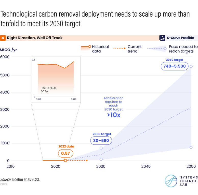 The Intergovernmental Panel on Climate Change finds that, alongside immediate and steep reductions in GHG emissions, limiting warming to 1.5 degrees C with no or limited overshoot now relies on carbon removal, including both land-based measures like reforestation and technological approaches like direct air capture (DAC). By 2030, technological carbon removal rates, specifically, need to reach between 30 and 690 MtCO2 per year, but in 2022, less than 1 MtCO2 was removed. To get on track for 2030, these technological approaches must scale up more than 10 times faster.