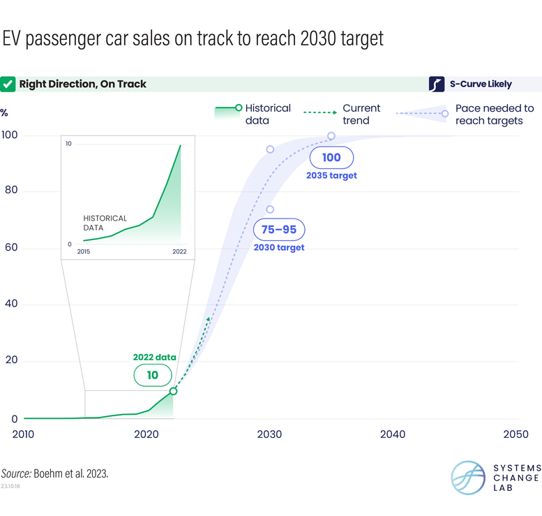 But it’s not all bad news: Over the past five years, the share of electric vehicles in passenger car sales grew exponentially at an average annual rate of 65% — up from 1.6% of sales in 2018 to 10% of sales in 2022 — putting this indicator on track for 2030. Global efforts are also heading in the right direction at a promising, albeit still insufficient, pace for another six indicators, including those focused on the scale-up of zero-carbon power, reforestation and mandatory corporate climate risk disclosure.