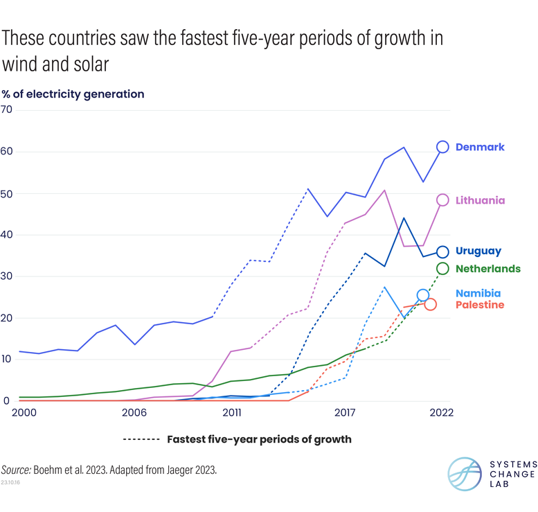 Encouragingly, some of the fastest growth in renewable power generation has occurred across developing countries, such as Namibia and Uruguay, where wind and solar scale-up is also helping to bolster energy security and expand access to electricity. Achieving 1.5 degree C-aligned targets for zero-carbon power, however, will require such gains to accelerate dramatically — the global share of solar and wind in electricity generation has been growing by an annual average of 14%, but this needs to reach 24% by 2030.