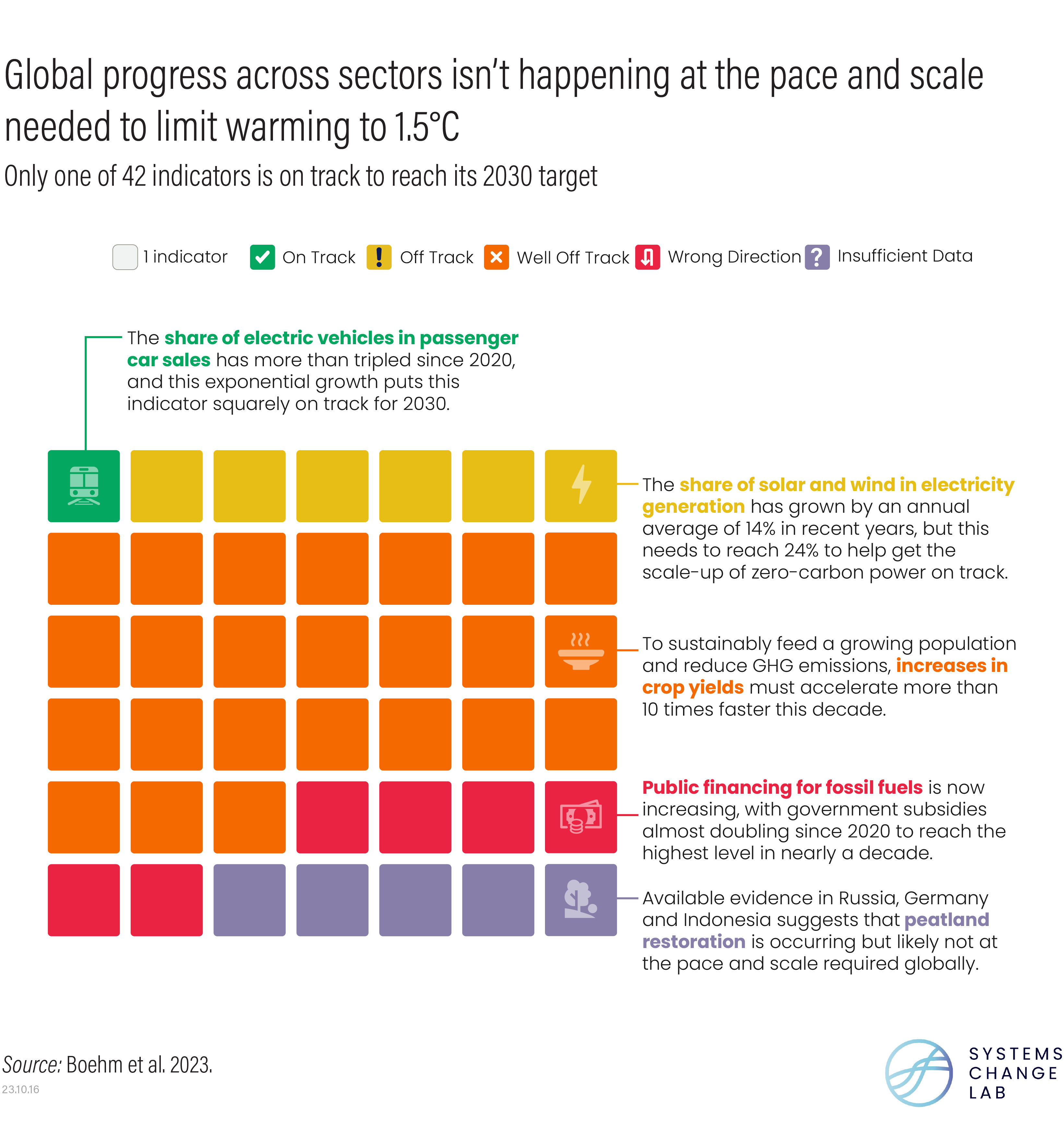 To help answer these questions, the State of Climate Action 2023 report provides a comprehensive roadmap of what’s needed by 2030 and 2050 to limit warming to 1.5 degrees C (2.7 degrees F), the limit scientists say is necessary for preventing increasingly devastating and irreversible impacts of climate change. It sets out the specific targets each sector will need to hit to achieve Paris Agreement goals and assesses where the world is today. This year’s analysis shows that of the 42 indicators of progress assessed, only one — sales of electric cars — is on track to reach its 2030 target and help keep 1.5 degrees C within reach.