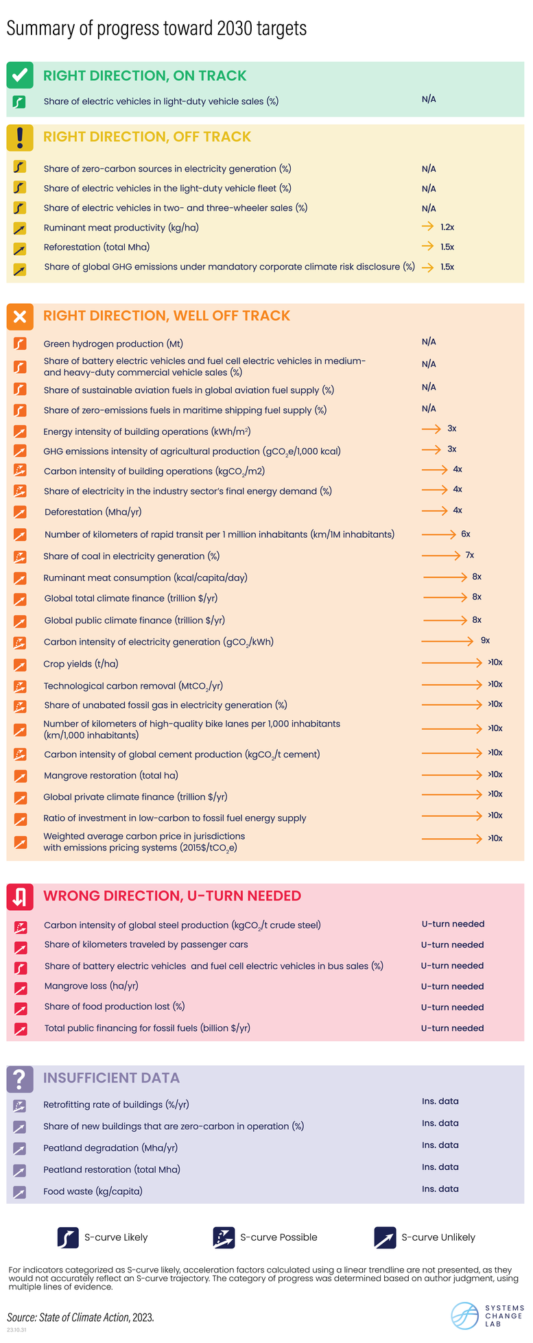 In fact, progress for more than half of the indicators — including efforts to phase out coal in electricity generation, decarbonize buildings and reduce deforestation — remains well off track, such that the world will need to see at least a twofold acceleration this decade. For another six, recent trends are heading in the wrong direction entirely.