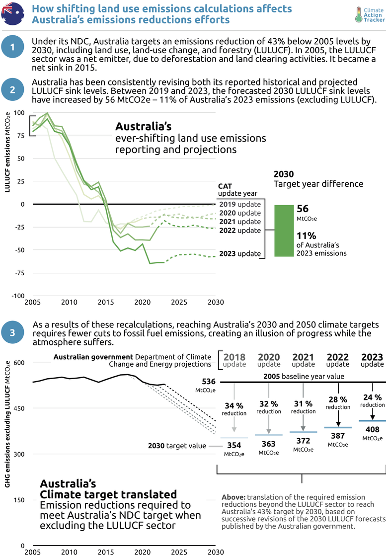 Australia's emission reductions in fossil fuel and related GHG emissions are expected to be only 17% below 2005 levels by 2030 without counting the land sector's sinks, a far cry from the apparent 37%. As we show in this update, this is a consistent and persistent pattern for Australia.