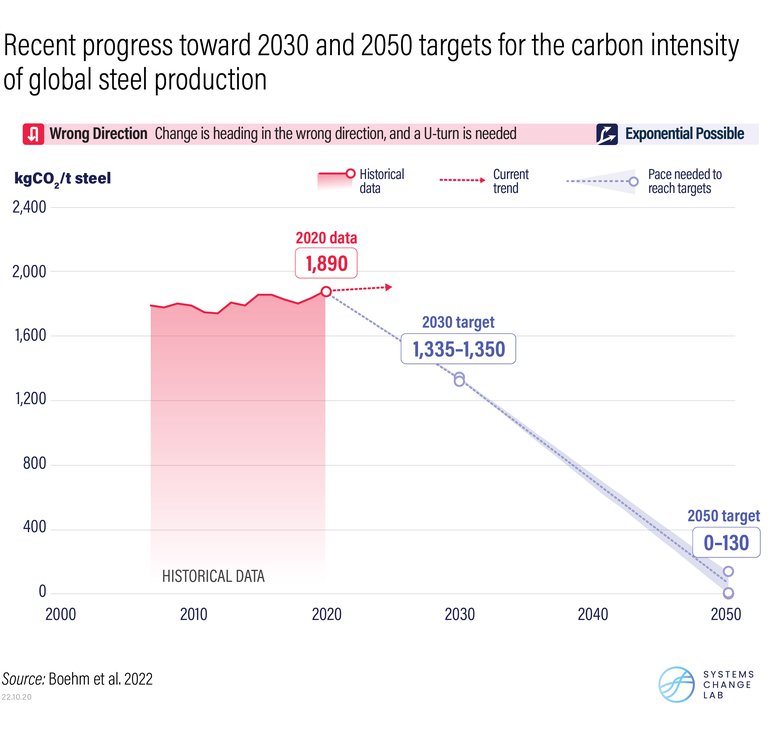 It’s also critical to develop new technologies that can decarbonise the hardest-to-abate industrial operations, including high-heat processes that cannot easily be electrified or chemical reactions that emit GHGs (known as “process emissions”). Recent efforts to improve the carbon intensity of cement production, for example, remain well off track, requiring these gains to accelerate more than 10 times faster this decade. Even more concerning, the carbon intensity of steel production is heading in the wrong direction entirely, likely due to increased reliance on emissions-intensive production processes in China, which manufactures more than half of the world’s steel.
