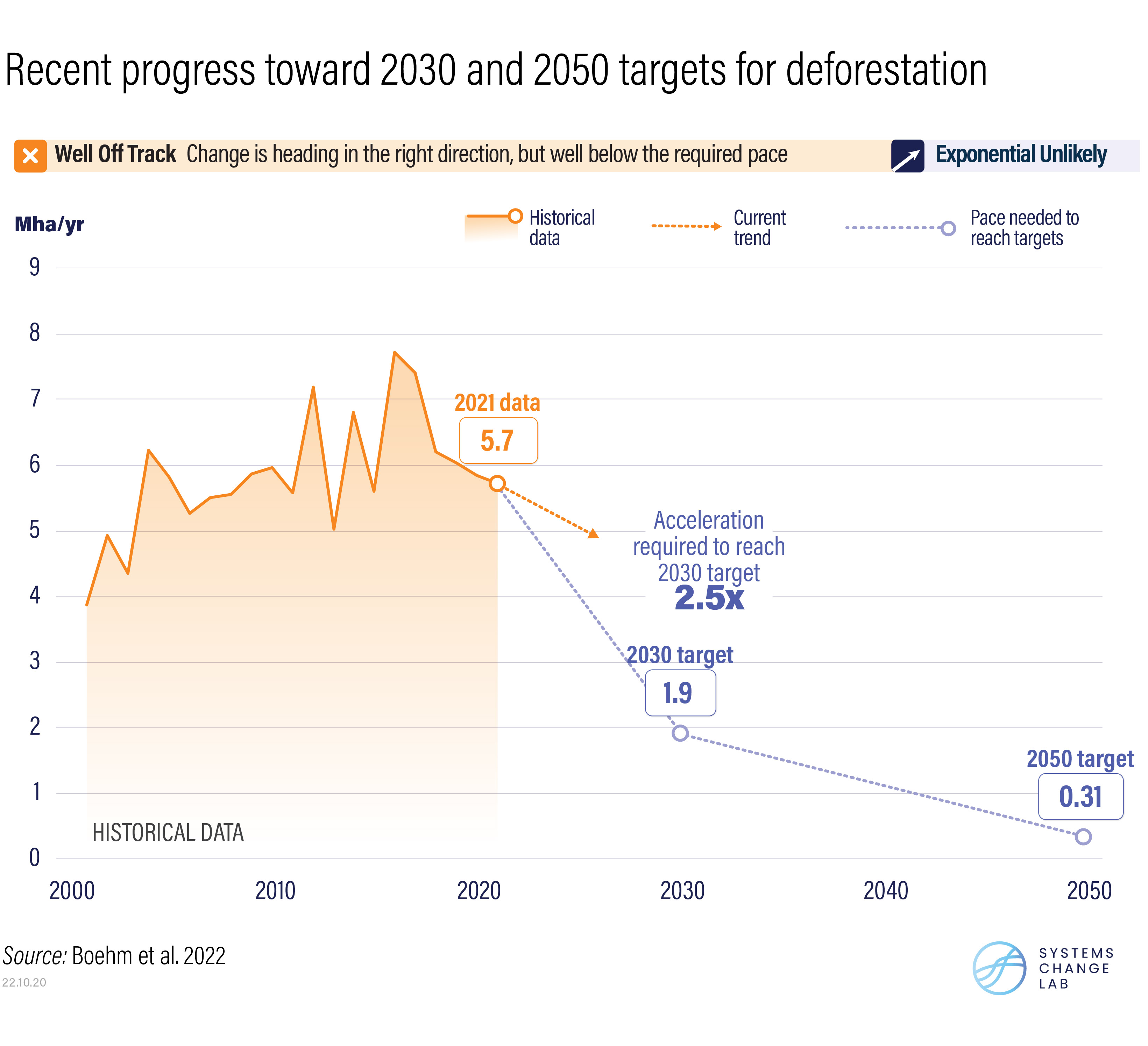 The world also needs to restore 300 million ha of forests and 20 million ha of peatlands by 2050, as well as 240,000 ha of mangroves by 2030. But here, too, progress toward near-term targets is inadequate. For example, getting on track for a 1.5˚C pathway would require the world to reforest an area roughly the size of South Korea (10 million ha) annually — about 1.5 times faster than current efforts.