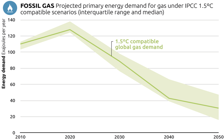 The set of 1.5°C-compatible modelled emissions pathways, including those from the latest report from the Intergovernmental Panel on Climate Change, shows that under most scenarios, total unabated natural gas consumption declines by a third between 2020 and 2030, and even further in the coming decades. This puts any additional fossil gas infrastructure that usually has a long lifetime at great risk of becoming stranded assets.