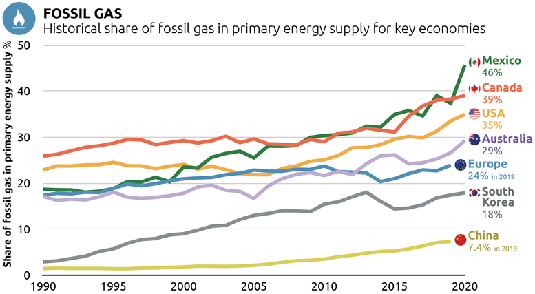 Figure 2: Share of natural gas in primary energy supply from 1990 to 2020. Source: CAT data portal, based on data from IEA World Energy Balances