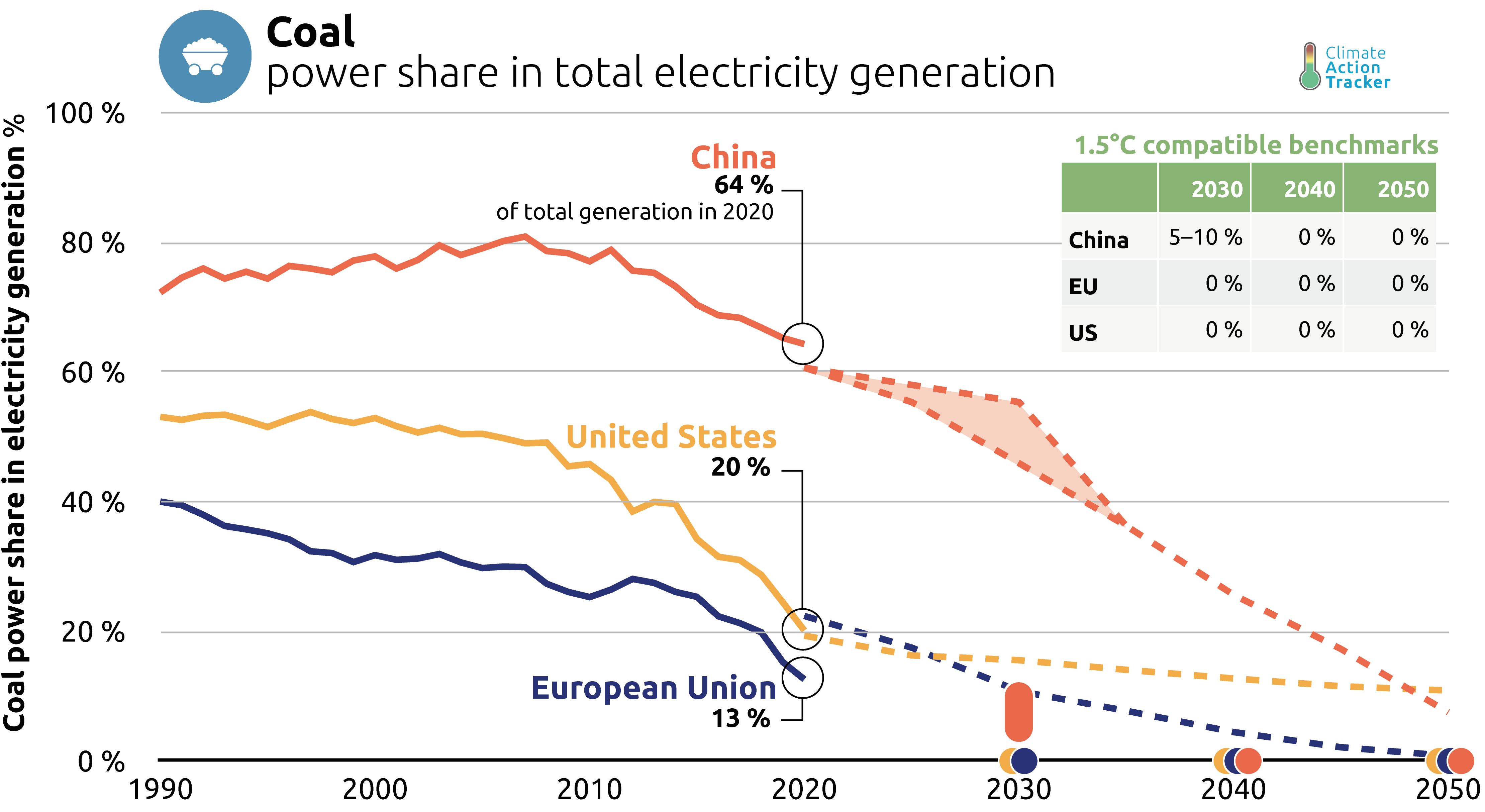 Users can zoom in to individual countries, can compare multiple indicators and countries, and can also download the data to make their own graphics. An example is the phasing out of coal-fired power generation in the three key economies of the US, the EU and China, illustrated in Figure 1. The clear misalignment between these countries’ current policy projections and the 1.5°C benchmarks show how much more effort is needed to put their coal-based power sectors on a Paris Agreement-compatible trajectory. China’s coal phase out needs to be brought forward by a couple of decades, and new policies are needed to ensure that the US and EU’s recent progress’ doesn’t stall.