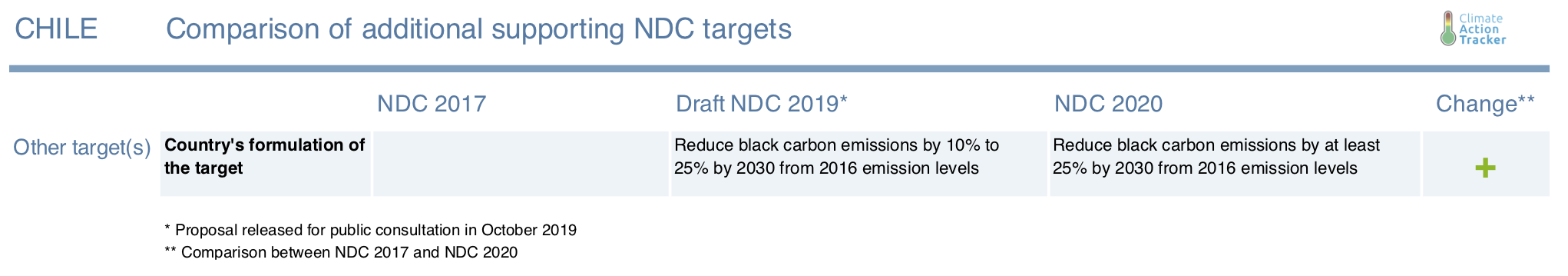 Chile’s updated NDC includes a separate target for black carbon emissions. It has committed to reducing those emissions by at least 25% below 2016 levels by 2030. This is a stronger target than that proposed in the October 2019 draft, which had a target of between 10 to 25%. A black carbon emission reduction target was not included in Chile’s first NDC.
