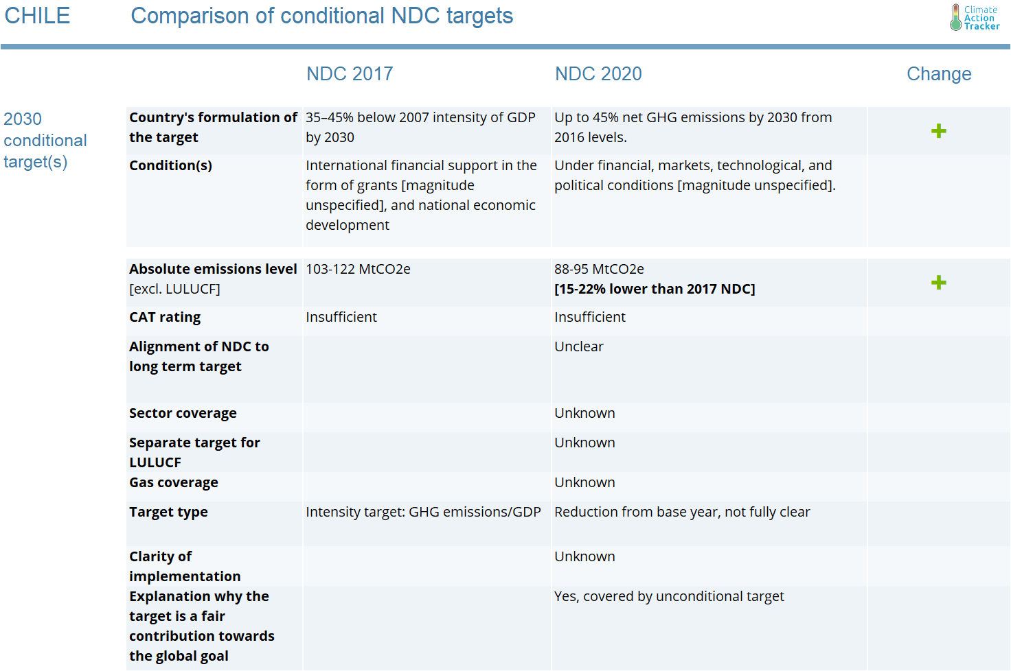 The NDC (and the proposal of 2019) clearly spells out Chile’s goal to achieve GHG neutrality by 2050. The previous NDC did not include such a goal, previous announcements were termed around carbon neutrality (not all greenhouse gases).